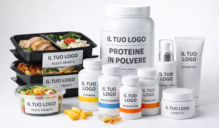 Pasti pronti, integratori e cosmetica a tuo marchio. Logistica e spedizioni incluse. Pensiamo a tutto noi.